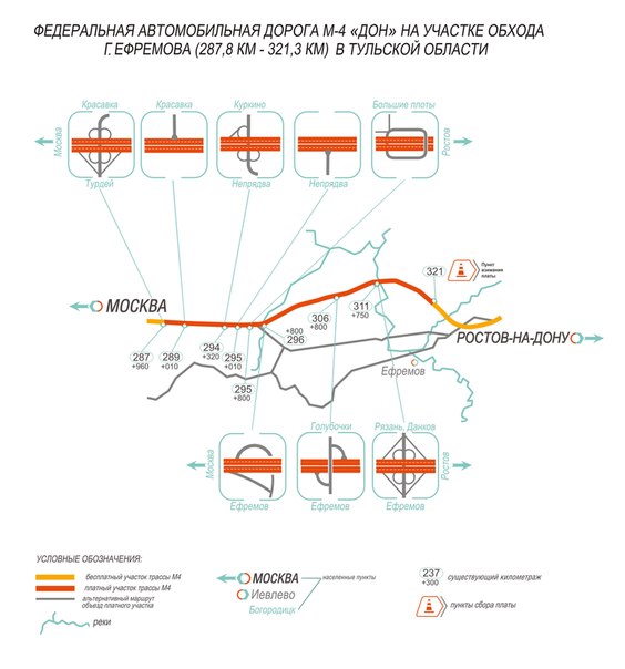 Участки федеральной автомобильной дороги М-4 «Дон» в обход города Богородицка (225-й км – 260-й км) и города Ефремова (км 287 – км 321) Тульской области начнут работать в режиме взимания платы за проезд 1 сентября 2013 года.