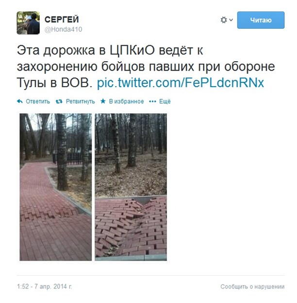 Неравнодушный туляк Сергей выложил фотографию просевшей дорожки в своем микроблоге.