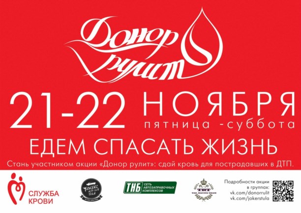 Напомним, 21 и 22 ноября автоклуб Jokers проведёт благотворительную акцию «Донор рулит». В ней могут принять участие неравнодушные граждане не моложе 18 лет и не легче 50 кг.