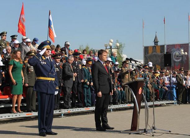После объезда парадного расчета Владимир Кочетков доложил губернатору Владимиру Груздеву о готовности воинских частей гарнизона к военному параду.