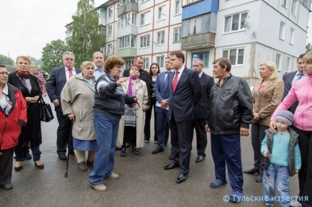 Иншинка, дом №16. Встреча губернатора с жителями по результатам работ по «Народному бюджету». В доме сделали новую крышу, фасадное утепление. Цена проекта 1,8 млн руб. Жители собрали 27% нужной суммы и победили в проекте «Народный бюджеть – 2014». Работы выполнял тульский подрядчик, и жители были очень довольны выполненными работами.