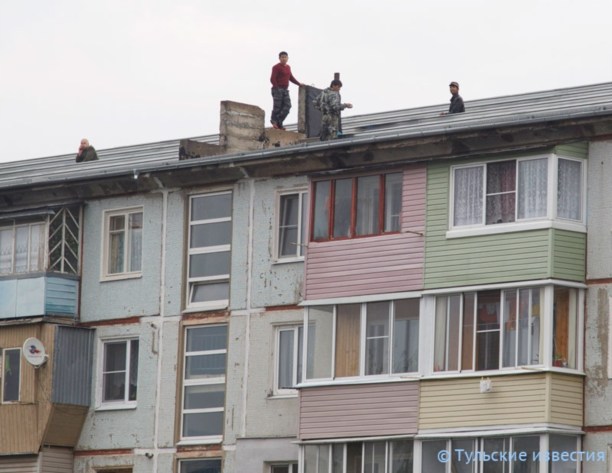 А жителям соседнего дома №7 не повезло. Подрядчик из Твери оказался, что называется, левый, своих работников — три шабашника из Средней Азии, которым не платит денег. А те, соответственно, и не работали. Вернее, просто просиживали рабочее время на вскрытой крыше. И таких вскрытых крыш в Туле оказалось 15! Пока было лето, сухо и тепло, жители ждали и надеялись, что вот-вот работы начнутся… Но начался дождь! И буквально за пару дней 5-этажка промокла аж до первого этажа!