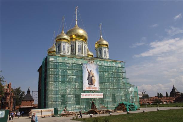 С каждым днем территория Тульского кремля преображается: мусора становится все меньше, а вот красоты все больше. Уже заменены купола на Успенском соборе, отстроено 12 метров колокольни, практически завершено строительство торговых рядов.