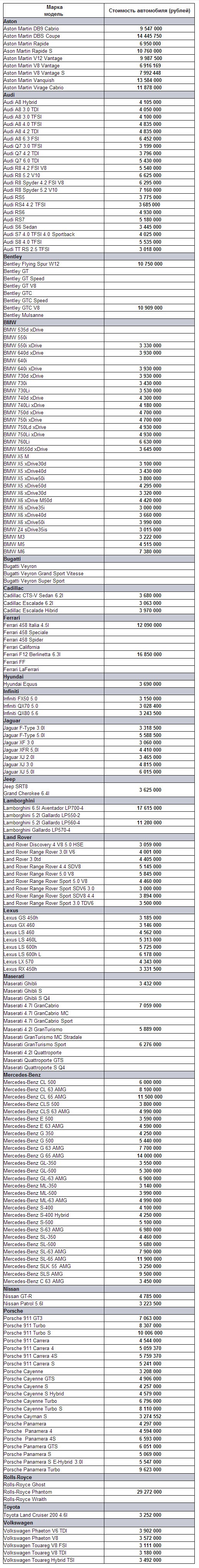Раскошелиться придется владельцам легковых автомобилей средней стоимостью более 3 млн рублей. Роскошными признаны авто Aston Martin, Audi, Bentley, BMW, Bugatti, Cadillac, Ferrari, Hyundai, Infiniti, Jaguar, Jeep, Lamborghini, Land Rover, Lexus, Maserati, Mercedes-Benz, Nissan, Porsche, Rolls-Royce, Toyota и Volkswagen. Всего в список вошла 191 марка автомобилей.