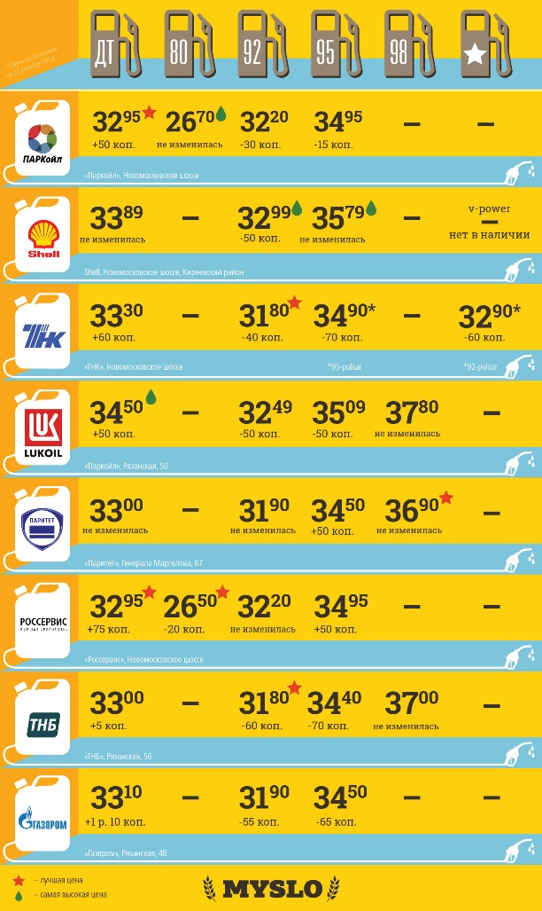 Напомним, первый раз мы собрали цены на бензин 24 ноября – ровно месяц назад. Тогда получилось, что самый дешёвый дизель в Туле продавали на АЗС «Газпрома», 80-й бензин – на «Россервисе» или «ПАРКойле». Также на «Россервисе» можно было залить дешёвый 92-й или 95-й, а самая приятная цена на 98-й обнаружилась на «Паритете».