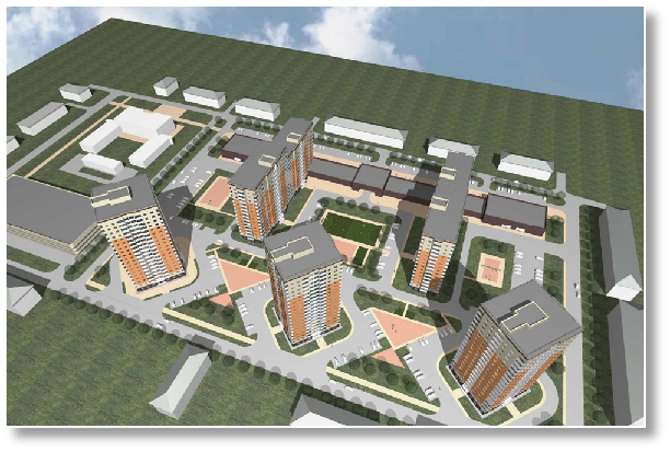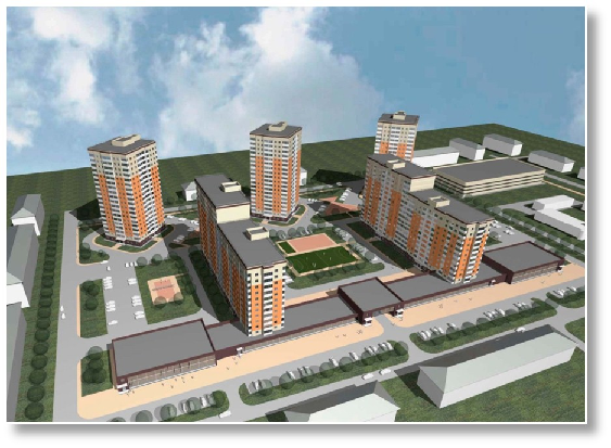 С тех пор проект стал цветным и больше похож на нынешний спорткомплекс. Неизвестно, поменялся ли план застройки района многоэтажками. В прошлом году застройщик показывал прессе вот такой проект: