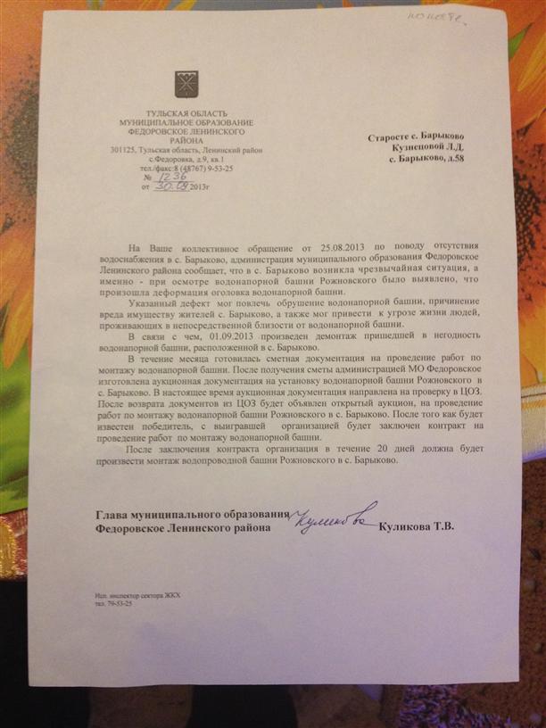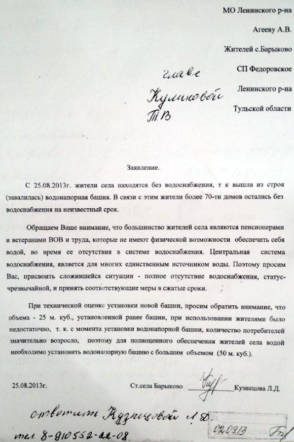 Весной 2013 года стало совсем худо – «грибок» окончательно накренился и вот-вот готов был рухнуть. Жители обращались куда только можно: писали в твиттер губернатору Тульской области, в «Единую Россию», в администрацию МО Федоровское Ленинского района и в администрацию Ленинского района. В ответ им предложили пользоваться водой из колодцев, что располагаются на территории села.