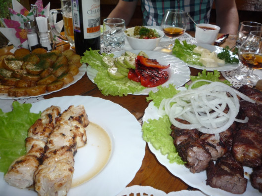 Брали одну порцию курицы, две шейки свиной, три порции печеной картошки, лаваш, один салат Дачный (с говядиной, зеленым горошком, сыром и свежим помидором), порцию овощей на гриле, бутылку красного сухого вина и 300г коньяка (7летний армянский), счет около 8т.р., но порции- это какие-то гиганты, достаточно глянуть на эту одну порцию куриного шашлыка- громадина.